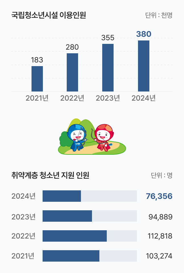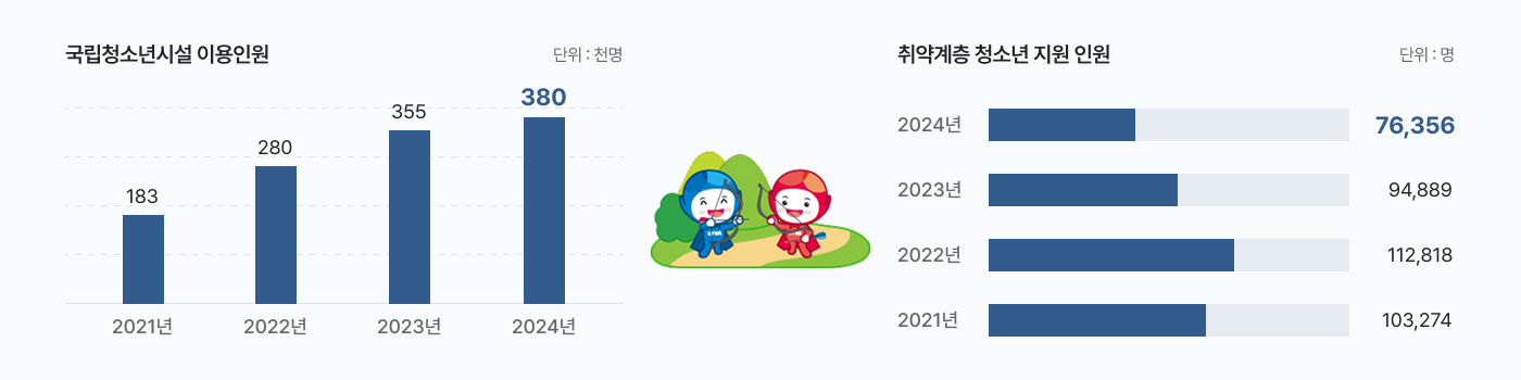 - 정신적, 신체적, 환경적 요인으로 인하여 교육, 문화, 복지에서 소외된 청소년의 활동 참여 기회를 보장하기 위해 다양한 활동을 지원합니다.