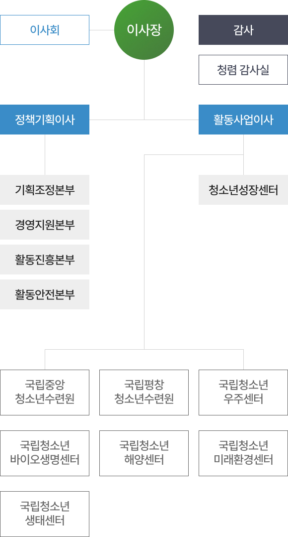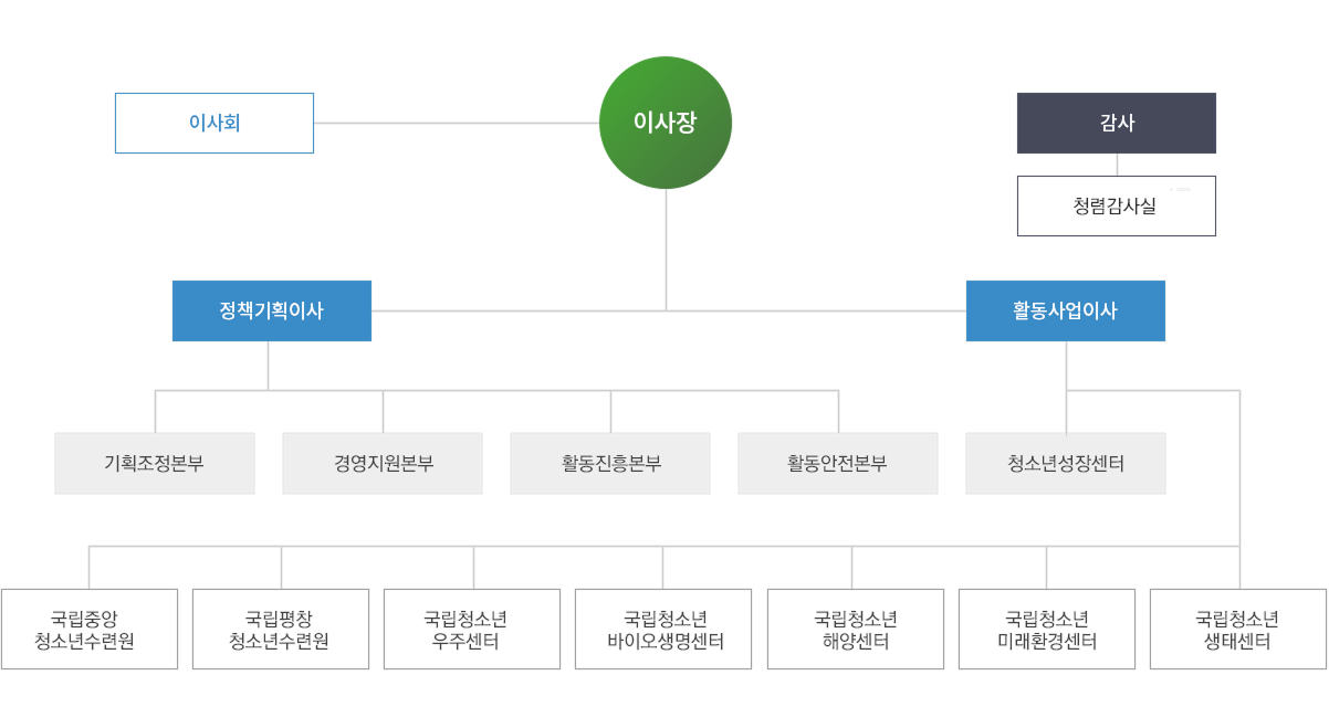 오른쪽은 '활동사업이사'로, 하위 조직에 '활동안전본부', '청소년성장센터'가 있으며, 연결된 소속 기관은 '국립청소년해양센터',